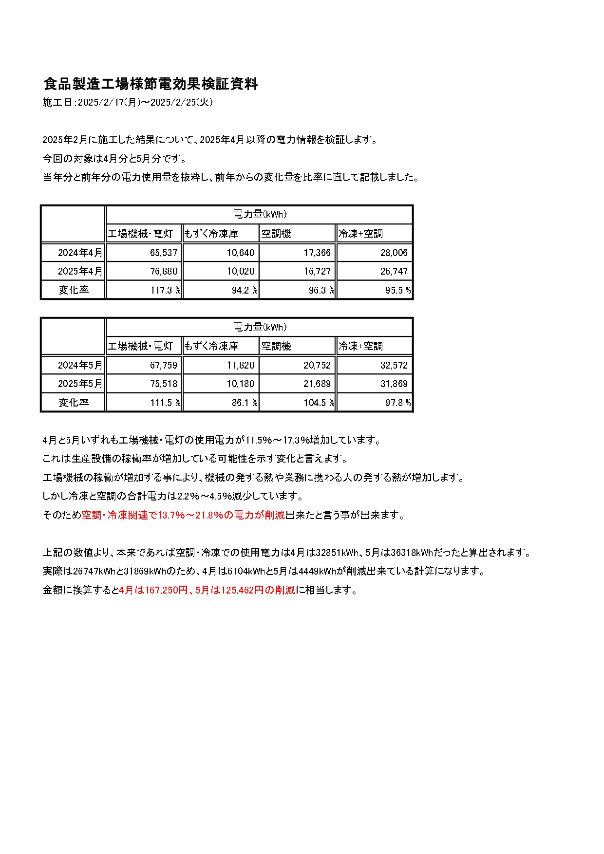 この工場では2025年2月にテラノペイントを施工し、翌4〜5月の電力データを前年と比較しました。